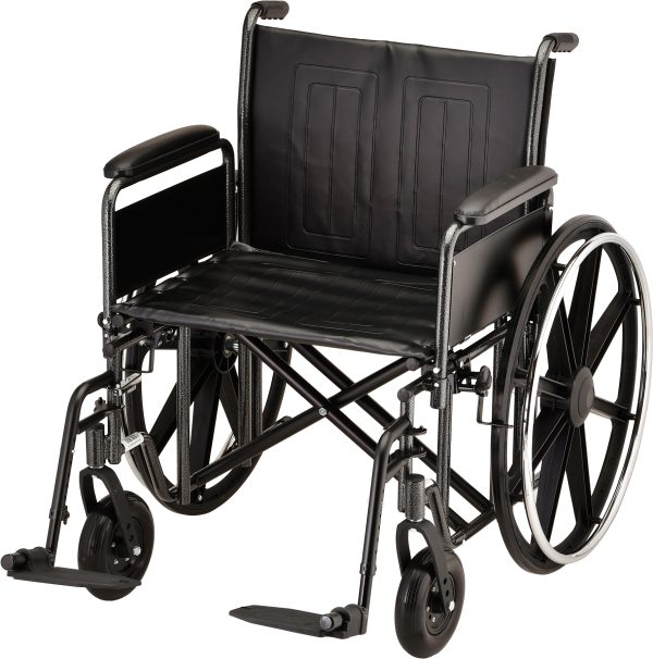 The Steel Wheelchair 22 inch (5221S) comes equipped with detachable and reversible full arms and swing away footrests. It also features dual axle positions for quick seat height conversion and flame retardant black vinyl upholstery. There are industry compatible accessories available for this product.